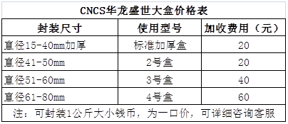 【以上優(yōu)惠活動(dòng)限“標(biāo)準(zhǔn)鑒評(píng)”,如送評(píng)錢幣需大盒封裝(錢幣直徑41mm-100mm)大盒另收費(fèi)用,即實(shí)際費(fèi)用為:標(biāo)評(píng)評(píng)級(jí)費(fèi)x折扣數(shù)+大盒費(fèi)用,具體收費(fèi)標(biāo)準(zhǔn)請(qǐng)參考CNCS官網(wǎng))。